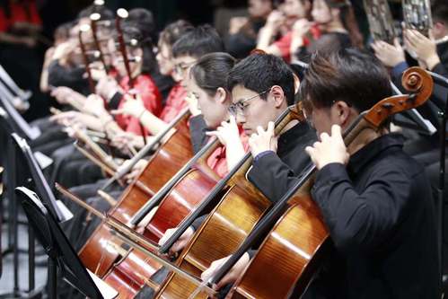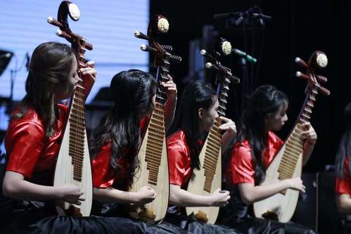 接下来,同学们献上一曲琵琶八重奏《梦入江南》,粉墙黛瓦,烟雨霏霏,乌篷摇船,在描绘江南水乡美景之余,更是展现了琵琶优雅的韵味、灵动的音色和丰富的旋律。最后,由我校青年教师、民乐团拉弦声部指导教师周橙担任独奏、民乐团协奏的一曲《夜深沉》荡气回肠,戏剧性的强大张力和由京胡演奏带来的中国风之气派更是令观众震撼。
