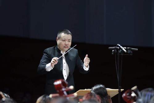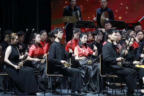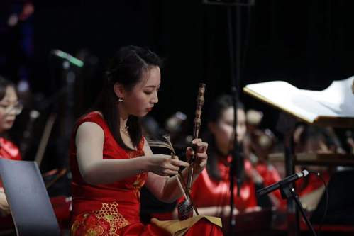 本场音乐会上,我校学生民乐团在青年指挥家刘捷的指挥下带来了参加历届全国大学生艺术展演的金奖曲目以及为祖国七十周年华诞献礼的经典曲目。在上半场中,民乐团经典再现了一首《月儿高》,该曲描绘了月亮从海上升起直到西山低垂这一过程的美景,全曲华丽缠绵、寄情于景,极具中国传统文化之美。凭借此曲,民乐团斩获第五届全国大学生艺术展演一等奖。