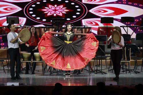 下半场的开场,由在校新疆学生以及预科班同学组成的新疆打击乐团倾情献上《欢乐的庆典》,打击乐与舞蹈的融合展现新疆人民热情、热爱劳动的民族特色。接着,周橙老师及我校人文学院副教授、民乐团指导教师、国家级非物质文化遗产“江南丝竹”项目上海市代表性传承人阮弘老师分别担任独奏,先后献上了《长城随想》、《节日的天山》两首协奏曲,体现了对祖国大好河山的热爱以及欢度节日的喜悦之情。最后,音乐会在大型民族管弦乐《丝绸之路》和《我的祖国》中落下帷幕。