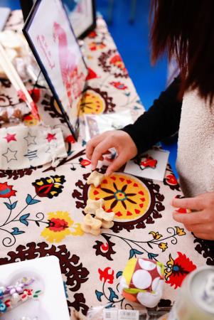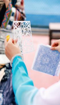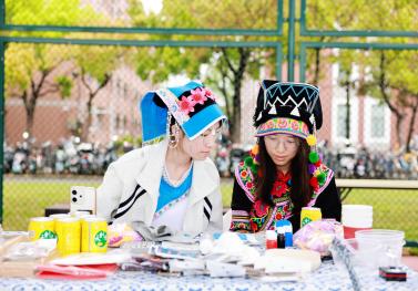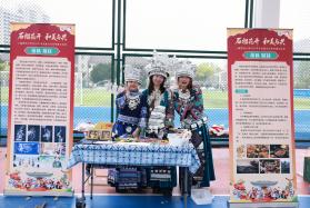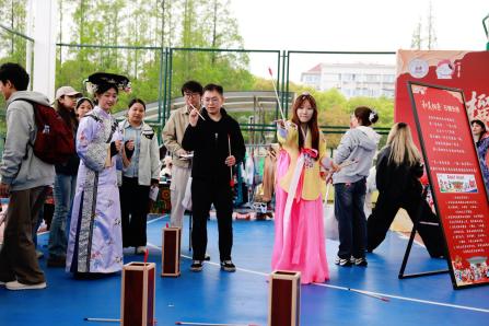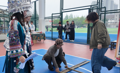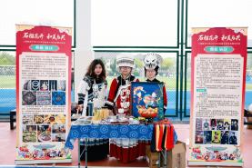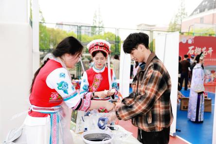 活动现场,分展区各具特色、精彩纷呈。维吾尔族展区的小花帽折纸制作、顶碗舞体验排起长队,在志愿者同学的鼓励下大家踊跃尝试、欢呼不断。在哈萨克族展区,热烈的“黑走马”舞蹈,节奏铿锵;师生们在鹰羽上写下美好祝福。藏族展区以藏骰、藏式文房四宝、书法体验,让大家近距离感受高原文化。蒙古族展区的射箭项目人气火爆,民俗讲解与特色美食令人流连忘返。苗族展区竹竿舞节奏明快、欢快热闹;浸染成花的扎染创作趣味十足。在布依族展区,师生逐句跟唱非遗歌曲《好花红》;传统蜡染拓印纹样精美,引得大家纷纷动手进行尝试。满族展区以投壶、噶拉哈、抽陀螺等传统游戏,让大家在欢笑中感受满族民俗的灵动与智慧。在白族展区,师生们一边感受“瓦猫”等民间艺术的古朴与灵性,一边进行甲马画创作。东乡族展区以拔棍、打牛儿传统游戏,三炮台盖碗茶品饮,让大家在竞技与茶香中感受东乡族的民俗特色。师生们在彝族展区领略三人拔河的团结之力,体验素葫芦彩绘中的匠心之韵。