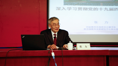 11月14日下午,上海财经大学党委理论学习中心组举行“不忘初心、牢记使命”主题教育集中学习研讨扩大会,邀请国家教育咨询委员会秘书长、教育部教育发展研究中心原主任张力来校作“深入学习贯彻党的十九届四中全会精神”辅导报告。报告会由校党委书记许涛主持,校党政领导和全体中层干部参加学习。