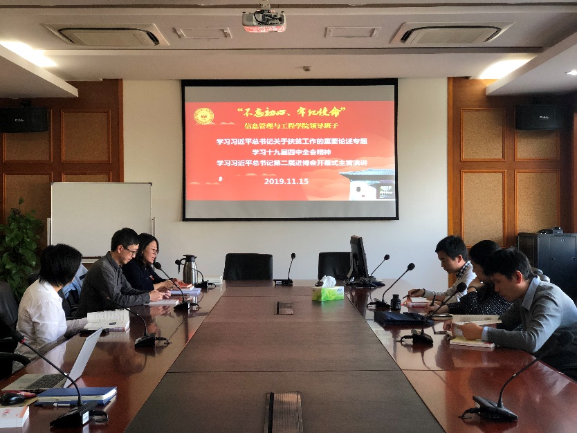 11月15日中午,领导班子及党委委员在学院308会议室召开专题讨论会,畅谈学习习近平总书记关于扶贫工作的重要论述、十九届四中全会精神、习近平总书记第二届进博会开幕式主旨演讲的体会。
