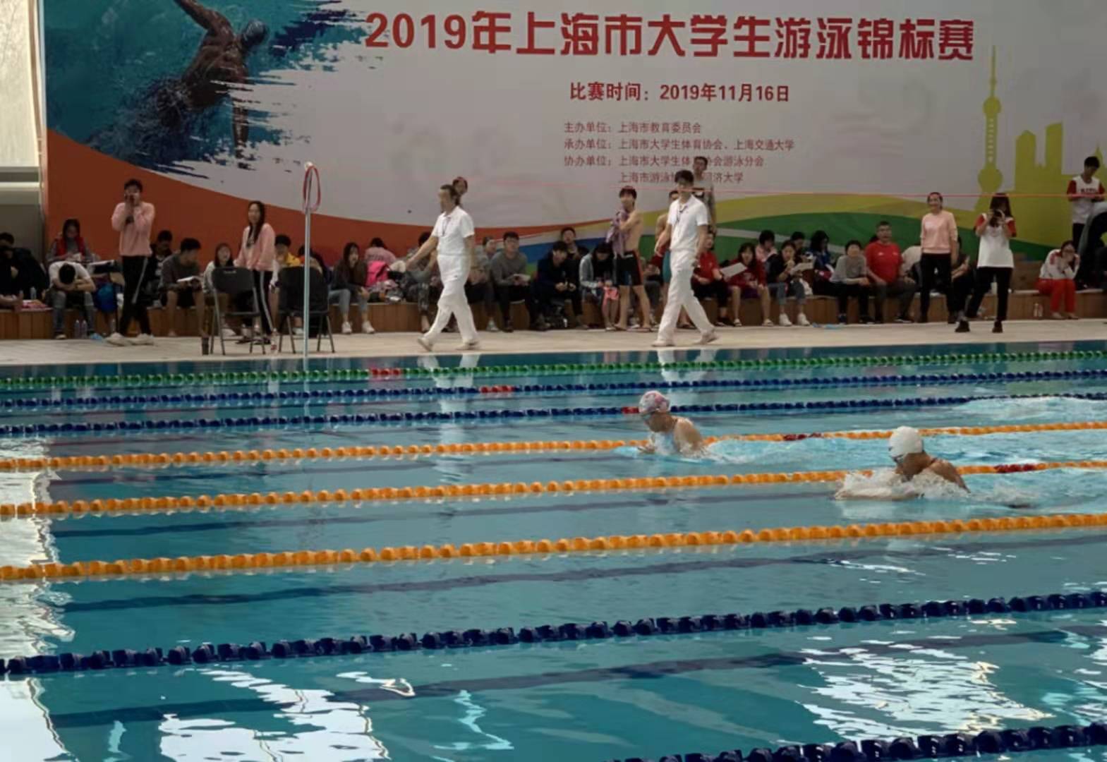 11月16日,2019年上海市大学生游泳锦标赛在同济大学(嘉定校区)游泳馆举行,此次比赛吸引了来自复旦大学,上海交通大学,上海财经大学和同济大学等23所高校共计427名运动员参赛。我校共派出19位同学参加了4项接力且20余项单项。经过了一天我校代表队的努力拼搏,最终取得了单项6金8银7铜,接力4银的佳绩。