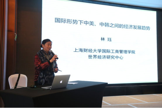 林珏对我校2017年百年校庆的情况进行了简单介绍,并强调我校于全年开展以“承上财厚德博学之志,传百年经济匡时之魂”为主题、惠及广大社会公众的公益讲座。就“国际形势下中美、中韩之间的经济发展趋势”这一专题,林珏从国际形势背景、中美经贸关系及发展趋势、中韩经贸关系及发展趋势三个部分展开详细解读。
