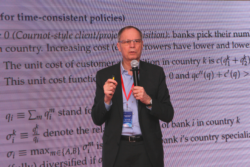 下午,诺贝尔经济学家 Jean Tirole 教授应邀作 "Industrial Monetary Policy" 的报告。他聚焦产业货币政策,研究了政府在提供流动性产业货币政策、控制国内经济活动的地理位置和持续发展时,对于银行国际化分工、法人机构设立地点、附属公司章程以及监管制度所产生的影响。当存在两个国家的不完全银行竞争,银行在某国的投资决策取决于该国获得流动性支持的可能性,而这种可能性取决于流动性援助的“泄漏”(对一国贷款可能为另一国带来部分收益),泄漏的结果又取决于银行在该国的存在形式(子公司还是分支机构)及两个国家达到科斯议价的能力等。
