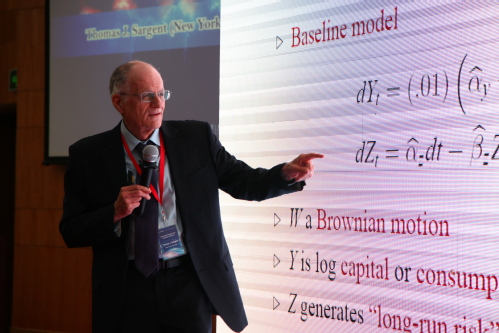 王能教授对各位主旨发言嘉宾进行了简短而隆重的介绍。论坛正式开始,首先由诺贝尔经济学家 Thomas J. Sargent 教授作题为 "Macroeconomic Uncertainty Prices when Beliefs are Tenuous" 的报告,介绍脆弱信念对宏观经济下不确定性价格的影响。论文指出,代表性投资者无法从一组良好定义的参数化结构模型中作最优选择。这种关于未来风险概率分布的不确定性也影响了均衡价格,使之与资产定价理论里的风险价格相区分。通过引入边际定价的不确定性下的偏好模型,论文得出结论:不确定性价格的时间波动源于代表性投资者对经济低增长率的高持续性和高增长率的低持续性的脆弱信念。