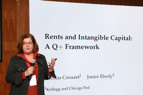 接下来,Janice Eberly 教授作 "Rents and Intangible Capital: A Q+ Framework" 的论文宣讲。该论文进一步挖掘无形资本和市场支配力在解释2000年以来投资动态中的潜在作用,通过引入经济租金(市场支配力)和无形资本,将传统投资-Q模型扩展和构造为新的函数模型,并利用现有数据对这些因素进行实证。经计算发现,租金、无形资产及其交互项在解释投资差距方面均起作用,交互项又占据主导地位。其原因在于无形资本的高回报性,具有市场支配力的公司可从中赚取租金。