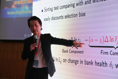 12月7日的论坛由王能教授主持。首先由Harrison Hong 教授作题为 "Sorting Out the Real Effects of Credit Supply" 的报告。通过提出一种持有成本较低银行(例如资产证券化能力较好的银行)向风险较高公司贷款的分类模型,研究了大萧条期间的银行信贷行为,并衡量不同银行在大萧条前后的持有成本。论文指出,目前的信贷市场分类方法对于实际的信贷供需关系的因果推论存在混淆,宏观金融中广泛应用的固定效应检验法则忽视了选择性误差产生的影响。