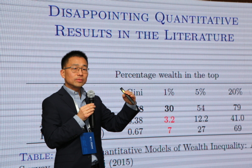 王能教授的报告主题为 "Stochastic Earnings Growth and Equilibrium Wealth Distribution",论文研究了美国的随机收益增长与均衡财富分配的关系,发现用横断面抽样法分析的财富分布曲线比整体财富分布曲线更具倾斜性和厚尾性。现有研究为了用数据解释观察到的财富不平等现象,对劳动收入冲击具有均值回归特点的基本 Aiyagari 模型进行各种修正,以强化富有代理人的储蓄动机。本文放弃了这种常规做法,而在一个世代交叠模型中简单假设了具有随机增长特点的劳动收入过程,从而产生了美国数据中观察到的财富洛伦兹曲线和基尼系数。其关键机制在于,受到正收益冲击的高收益者,预防性储蓄需求会相应增加,从而导致了富人更加富有的结果。