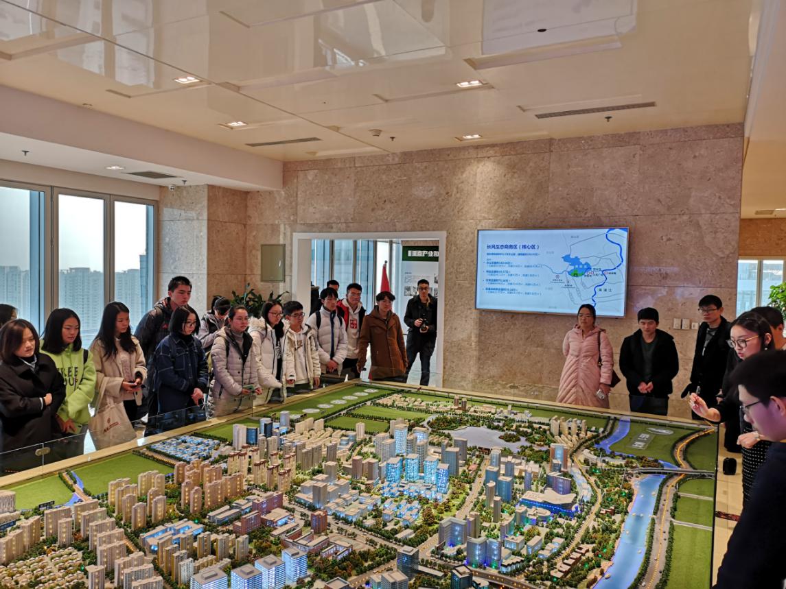 在长风生态商务区规划展示馆,讲解员以沙盘为载体,详细为同学们描述了长风生态商务区的立体化整体规划。