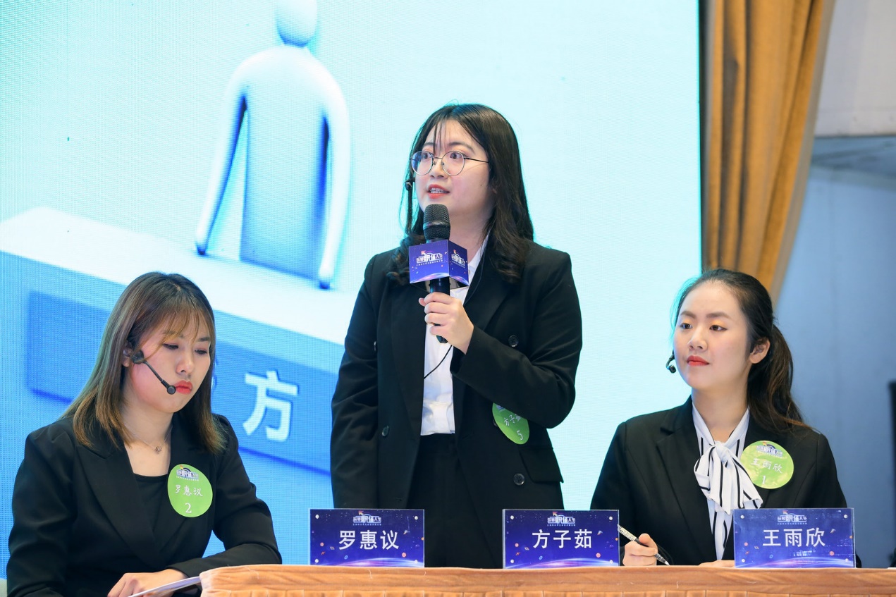 决赛第一轮,方子茹同学采用求职经历分享的方式,带来一场以《如何成为一名证券分析师?》为题的个人展示,介绍了自己的获奖经历、学生工作、实习经历以及职业梦想。第二轮辩论环节,以“作为毕业后第一份工作,你希望在新兴产品事业部挑战自我还是去拳头产品事业部获得系统培训机会?”为题,方同学担任反方四辩选手,和选手们一起展开激烈较量。