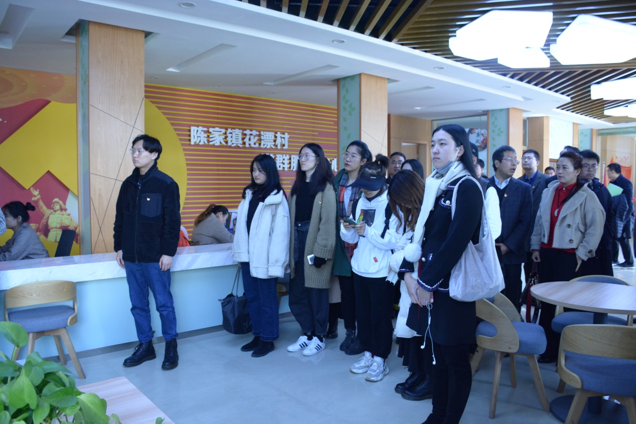 在陈家镇花漂村,师生们参观了村党群服务中心,聆听陈家镇镇长、村委会书记对花漂村村民服务、经济发展和智慧乡村建设等情况的详细介绍。许涛书记就村委会服务村民的联系机制进行交流。师生们还就农村空心化等问题与村委会同志进行讨论。随后,师生们参观了花漂村农村生活污水处理站,了解污水处理的运行过程。师生们从村容村貌中深刻感受到乡村振兴带来了农村的巨大变化和呈现出的新气象。