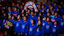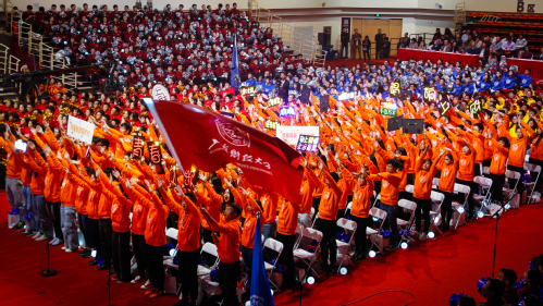 现场18个学生方阵还围绕“歌唱祖国”“校歌嘹亮”“青春颂歌”“唱响未来”4个主题进行了拉歌展示,跃动的歌曲、振奋的口号将歌会一次次推向高潮。作为“校歌嘹亮”环节的4所高校代表,我校学生方阵在拉歌环节深情演绎了校歌《共铸荣光》。“厚德博学,日新业煌.经济匡时,富民兴邦”:雄伟嘹亮的歌声在体育馆回荡,展现了我校学子志存高远,经世济国,服务于国家,奉献于时代的担当与责任。校旗挥舞,同学们“做上财人、铸上财魂”的使命感油然而生。
