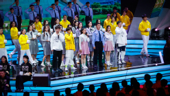 在由著名歌唱家、上海音乐学院院长廖昌永及华东师范大学教师吴睿睿领唱歌的歌曲《不忘初心》中,来自我校学生联合会、军事拓展团的75名旗手精神抖擞,挥舞着各校校旗参与表演,充分彰显了我校学子搏击奋进,弄潮时代的澎湃力量。